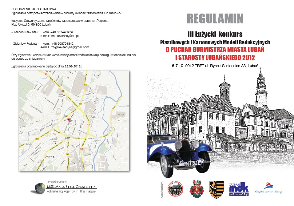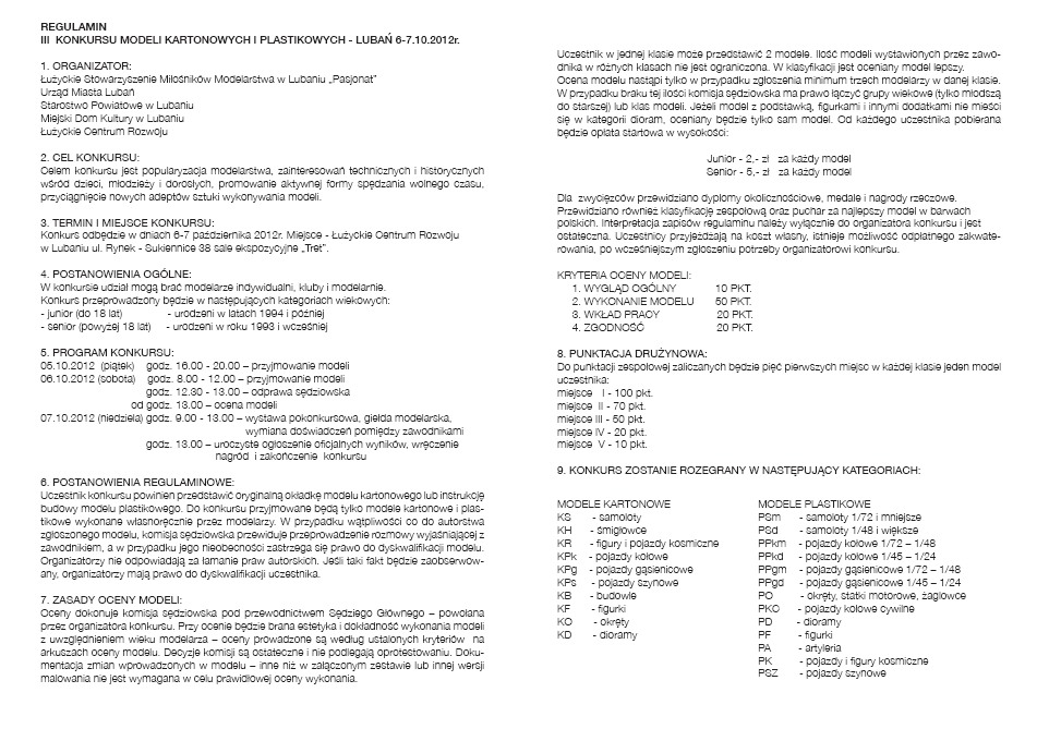 Konkurs odbędzie się w najbliższy weekend (06-07 10.2012r.) w Galerii Łużyckiego Centrum Rozwoju w Lubaniu. Zapraszamy serdecznie do udziału wszystkich chętnych modelarzy, którzy chcą pokazać swoje prace na nasz konkurs!