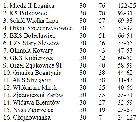 Podsumowując, do III ligi awansowały już wcześniej Miedź II Legnica i KS Polkowice. Z IV ligą żegnają się na pewno: Chojnowianka Chojnów, Nysa Zgorzelec, Widawa Bierutów i Zjednoczeni Żarów. Los Włókniarza Mirsk jest niepewny, zespół musi liczyć na to, że któraż z drużyn z wyższych lig np. nie zgłosi się do rozgrywek.