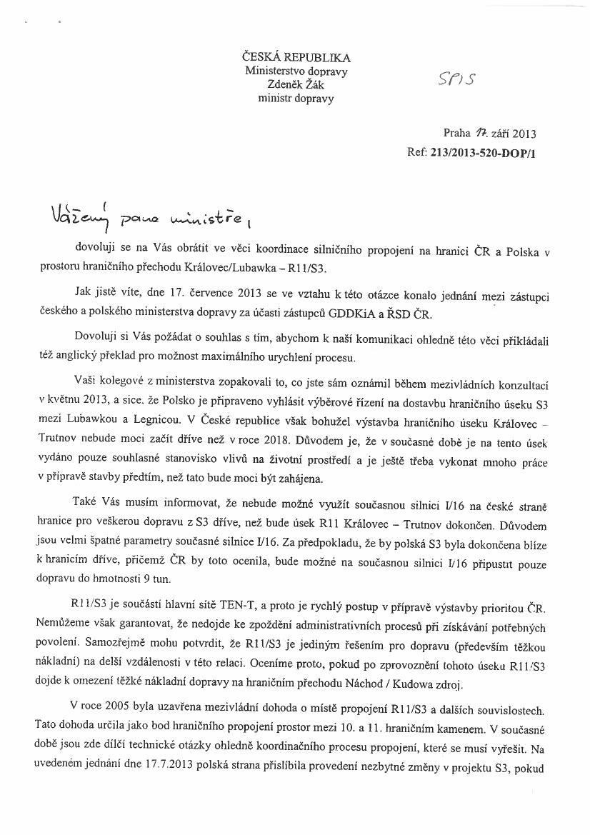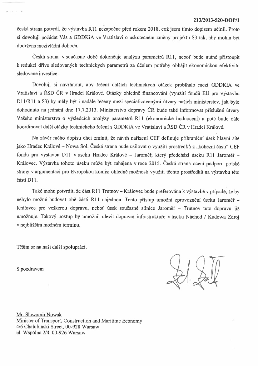 Posłanka udostępniła pismo podpisane przez Zdenka Żaka, ministra dopravy, z którego wynika, że Czesi z powodów formalnych nie zdążą z budową drogi R11 na odcinku Kralovec – Trutnov przed 2018 rokiem. Pismo to udostępniamy poniżej. Jest w języku czeskim, ale – jak podkreśla Z. Czernow – nie potrzeba tłumaczenia, by je zrozumieć.